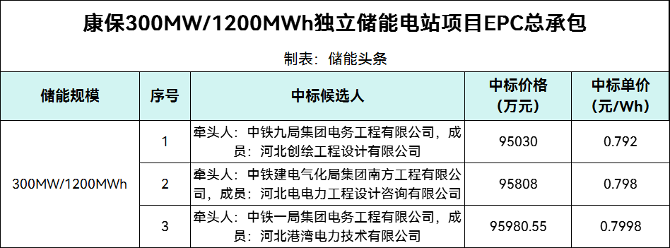 第三中标候选人为中铁一局集团电务工程有限公司河北港湾电力技术有限公司联合体,投标报价为95980.55万元,折合单价0.7998元/Wh。