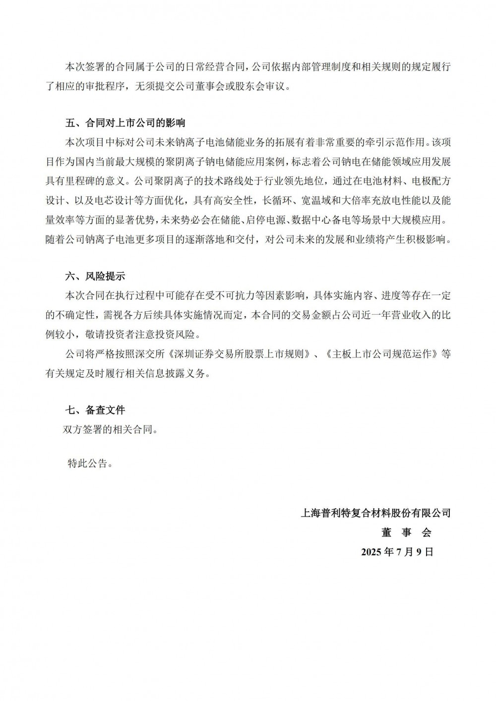 普利特表示,本次项目中标对公司未来钠离子电池储能业务的拓展有着非常重要的牵引示范作用。该项目作为国内当前最大规模的聚阴离子钠电储能应用案例,标志着公司钠电在储能领域应用发展具有里程碑的意义。公司聚阴离子的技术路线处于行业领先地位,通过在电池材料、电极配方设计、以及电芯设计等方面优化,具有高安全性,长循环、宽温域和大倍率充放电性能以及能量效率等方面的显著优势,未来势必会在储能、启停电源、数据中心备电等场景中大规模应用。随着公司钠离子电池更多项目的逐渐落地和交付,对公司未来的发展和业绩将产生积极影响。