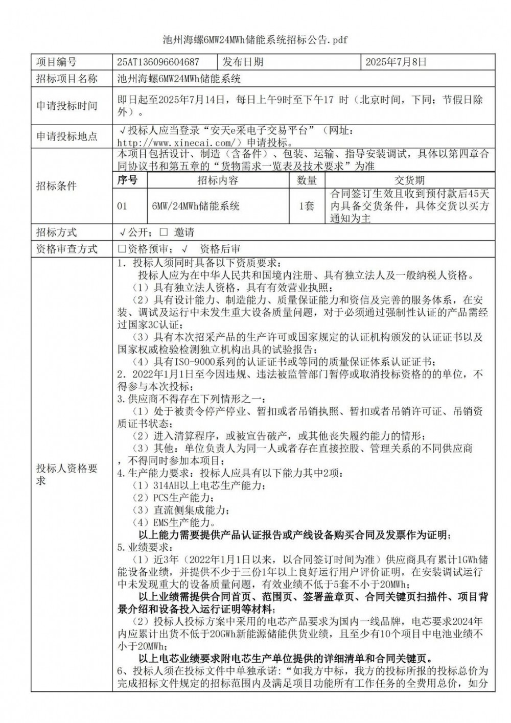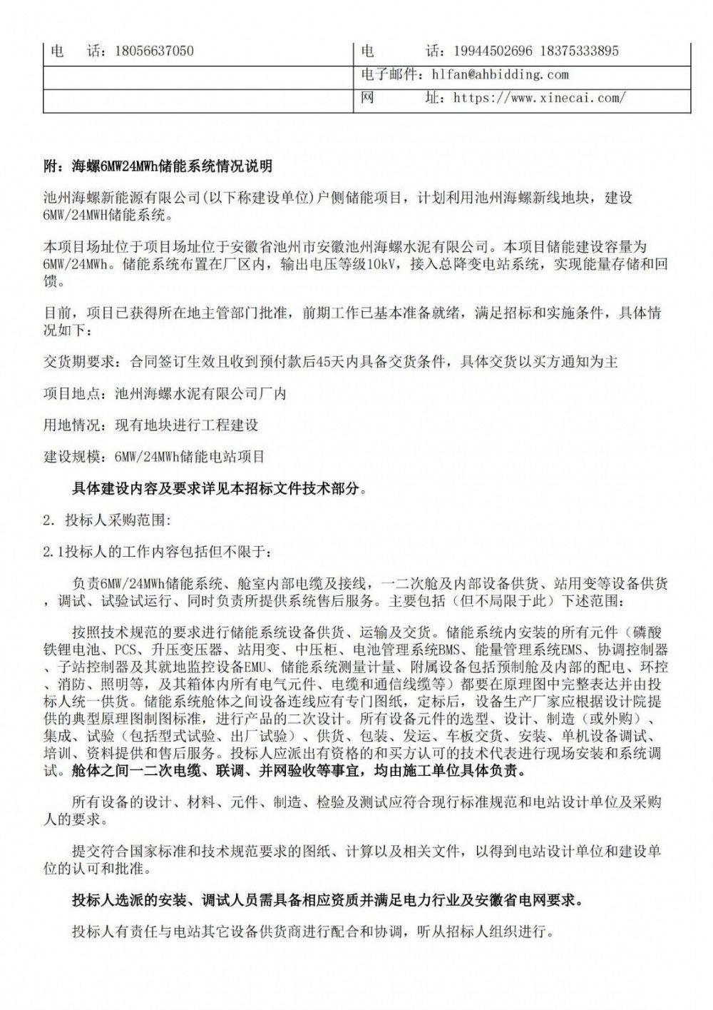 7月8日,池州海螺6MW24MWh储能系统招标公告发布,项目位于安徽省池州市,投标人负责6MW/24MWh储能系统、舱室内部电缆及接线,一二次舱及内部设备供货、站用变等设备供货,调试、试验试运行、同时负责所提供系统售后服务。