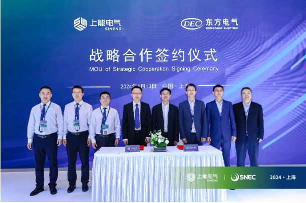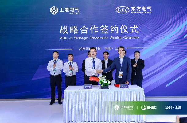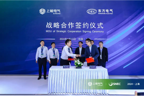 盛夏六月,上能电气股份有限公司(以下简称上能电气)与东方电气集团国际合作有限公司(以下简称东方国际)于SNEC 2024展会首日成功举办深化合作签约仪式,双方将在国内外新能源领域开展业务合作。