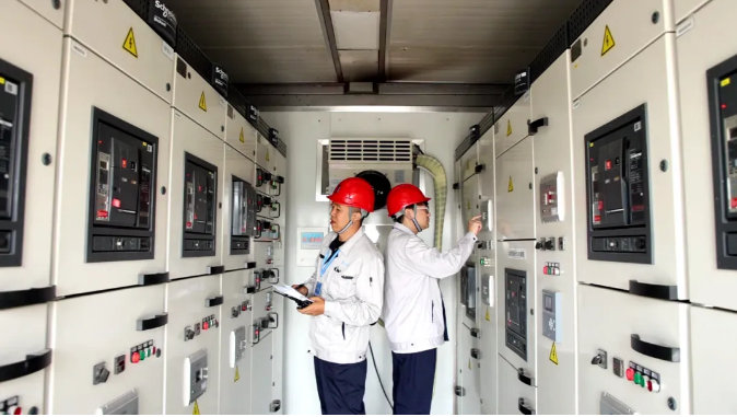 6月17日,在大连恒流储能电站内,运维人员赵承泰、张宁在进行升压前站用系统倒换操作