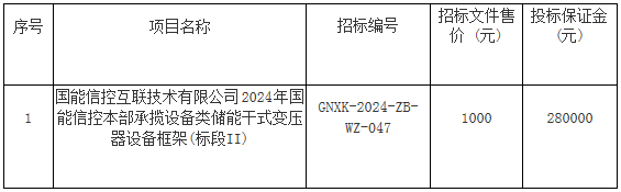 本招标项目名称为:国能信控互联技术有限公司2024年国能信控本部承揽设备类储能干式变压器设备框架(标段II),项目招标编号为:GNXK-2024-ZB-WZ-047,招标人为国能信控互联技术有限公司,资金来源为企业自筹。招标代理机构为国能龙源蓝天节能技术有限公司。本项目已具备招标条件,现对该项目进行公开招标。