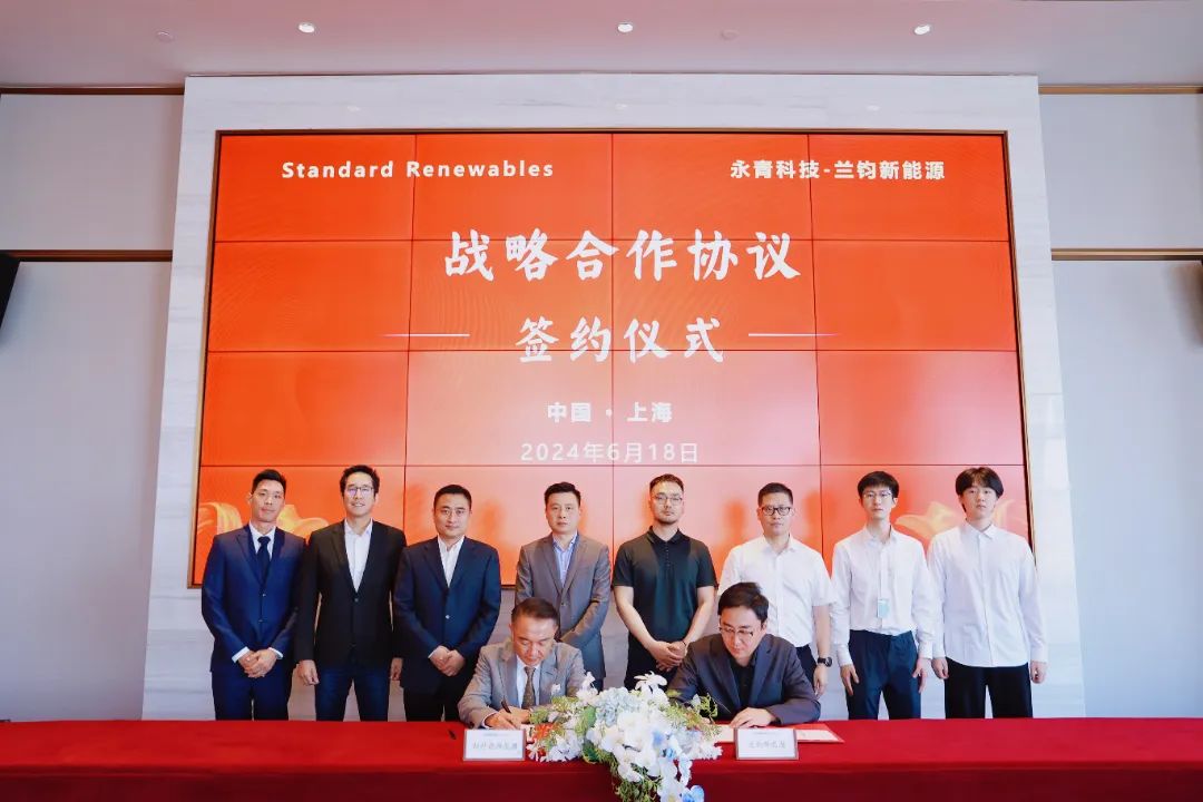 6月18日下午,永青科技集团旗下兰钧新能源科技有限公司与Standard Renewables在青山实业总部大楼举行战略合作签约仪式。永青科技集团副总裁、兰钧新能源董事长冯挺与Standard Renewables 创始人CEO 柯宏霖代表双方签署战略合作协议。