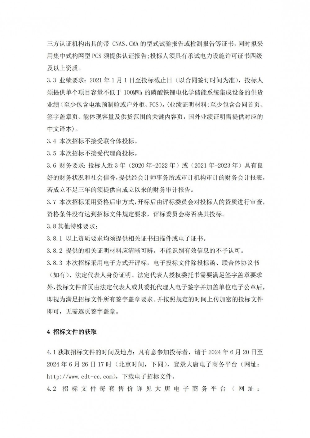 2021年1月1日至投标截止日(以合同签订时间为准),投标人须提供单个项目容量不低于100MWh的磷酸铁锂电化学储能系统集成设备的供货业绩(至少包含电池预制舱或户外柜、PCS)。