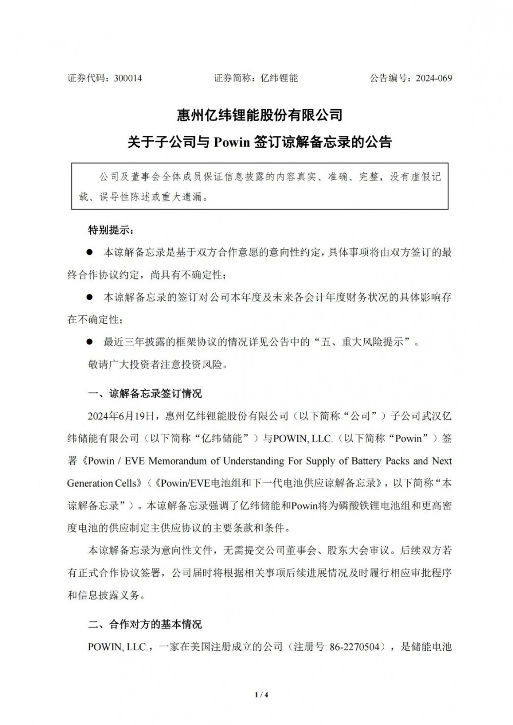 据电力家了解到,6月20日,亿纬锂能发布公告称,公司子公司武汉亿纬储能有限公司(以下简称“亿纬储能”)与POWIN, LLC.(以下简称“Powin”)签署《Powin / EVE Memorandum of Understanding For Supply of Battery Packs and NextGeneration Cells》(《Powin/EVE电池组和下一代电池供应谅解备忘录》。本谅解备忘录强调了亿纬储能和Powin将为磷酸铁锂电池组和更高密度电池的供应制定主供应协议的主要条款和条件。