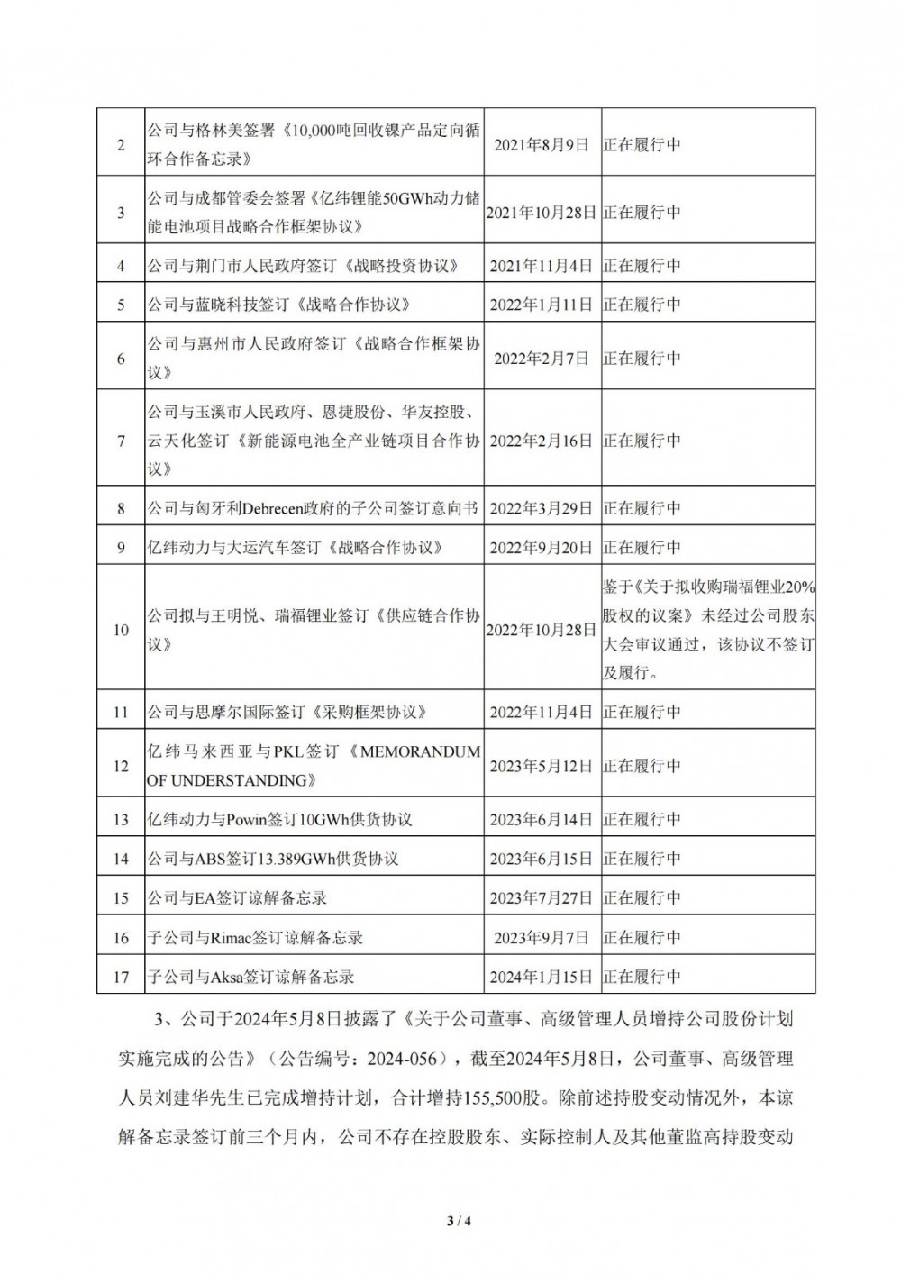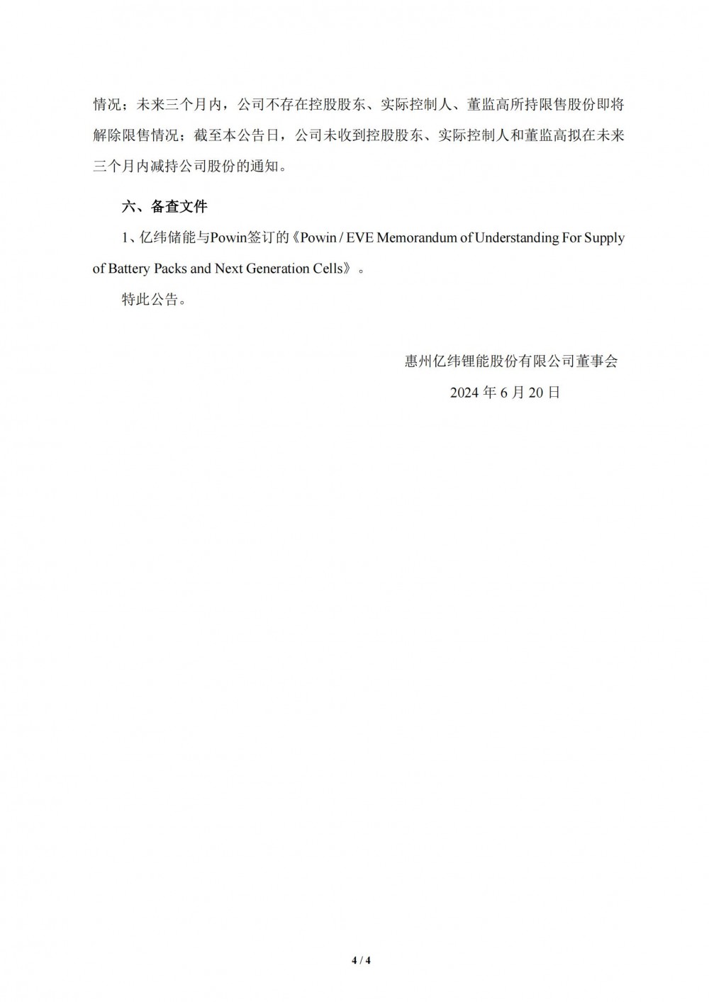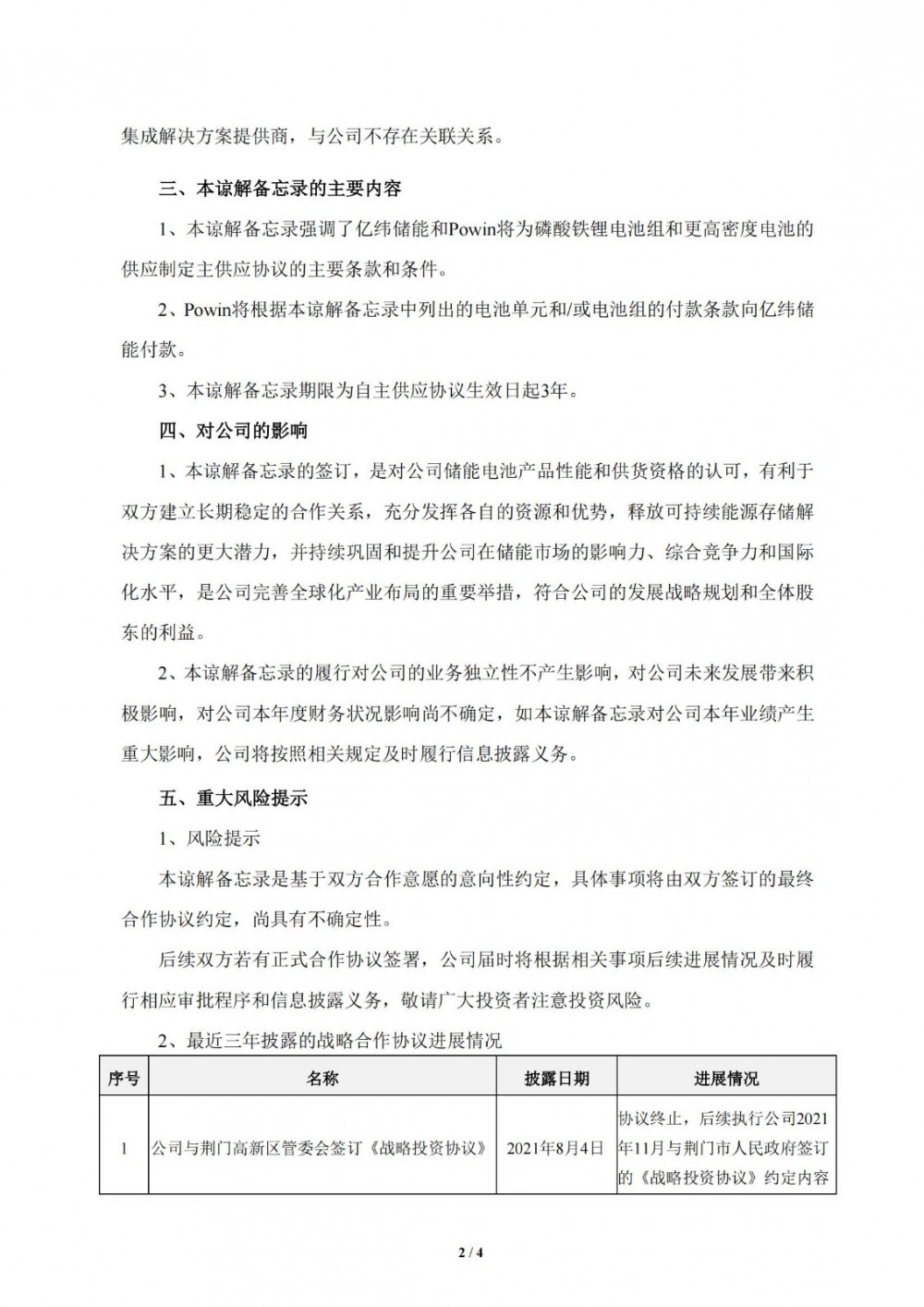 本谅解备忘录强调了亿纬储能和Powin将为磷酸铁锂电池组和更高密度电池的供应制定主供应协议的主要条款和条件。Powin将根据本谅解备忘录中列出的电池单元和/或电池组的付款条款向亿纬储能付款。本谅解备忘录期限为自主供应协议生效日起3年。