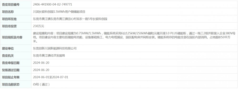 据悉,川润长银科创园1.5MWh用户侧储能项目位于东莞市黄江镇东莞市黄江镇田心村宾农一路5号长银科创园,总投资230万元。