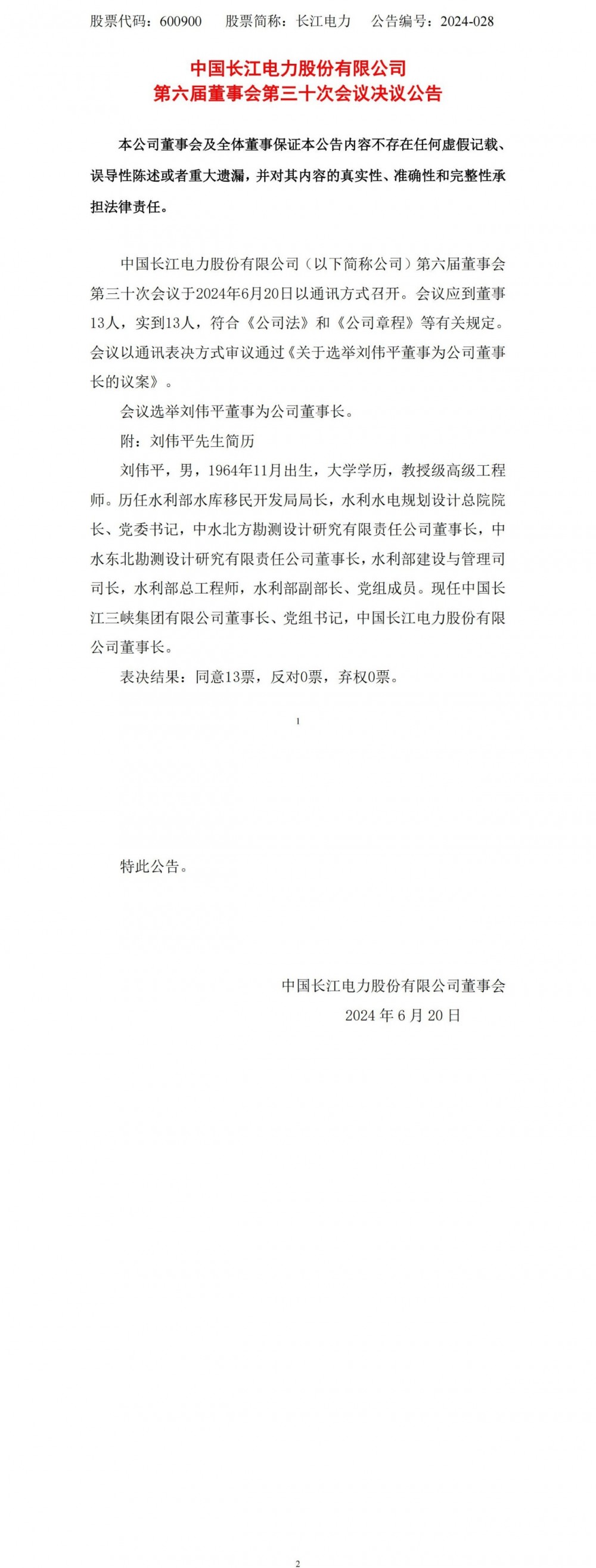 据电力家了解到,6月20日,长江电力发布公告,第六届董事会第三十次会议于6月20日召开,会议选举刘伟平董事为公司董事长。