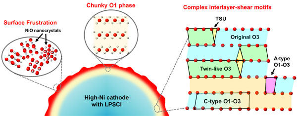 研究表明,全固态电池的晶格失氧和局部应力耦合驱动的表面晶格碎化以及脱锂诱发的剪切相变共同导致层状氧化物的结构性能退化。表面晶格碎化涉及纳米级多晶岩盐相的形成。这一失效模式在层状氧化物正极材料中被发现。此外,该研究还发现了区别于传统锂离子电池中层状正极的剪切界面新构型和大尺寸O1相的形成。