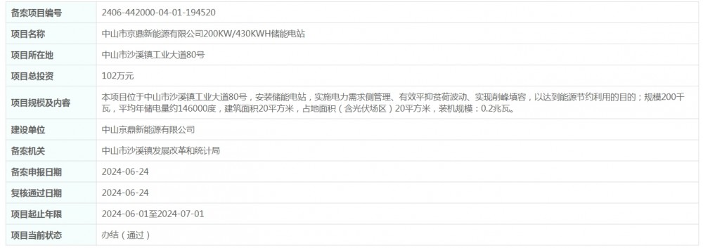 据电力家了解到,近日,中山市京鼎新能源有限公司200KW/430KWH储能电站获得备案。项目位于中山市沙溪镇工业大道80号,总投资102万元。