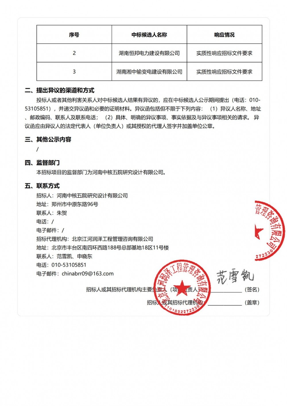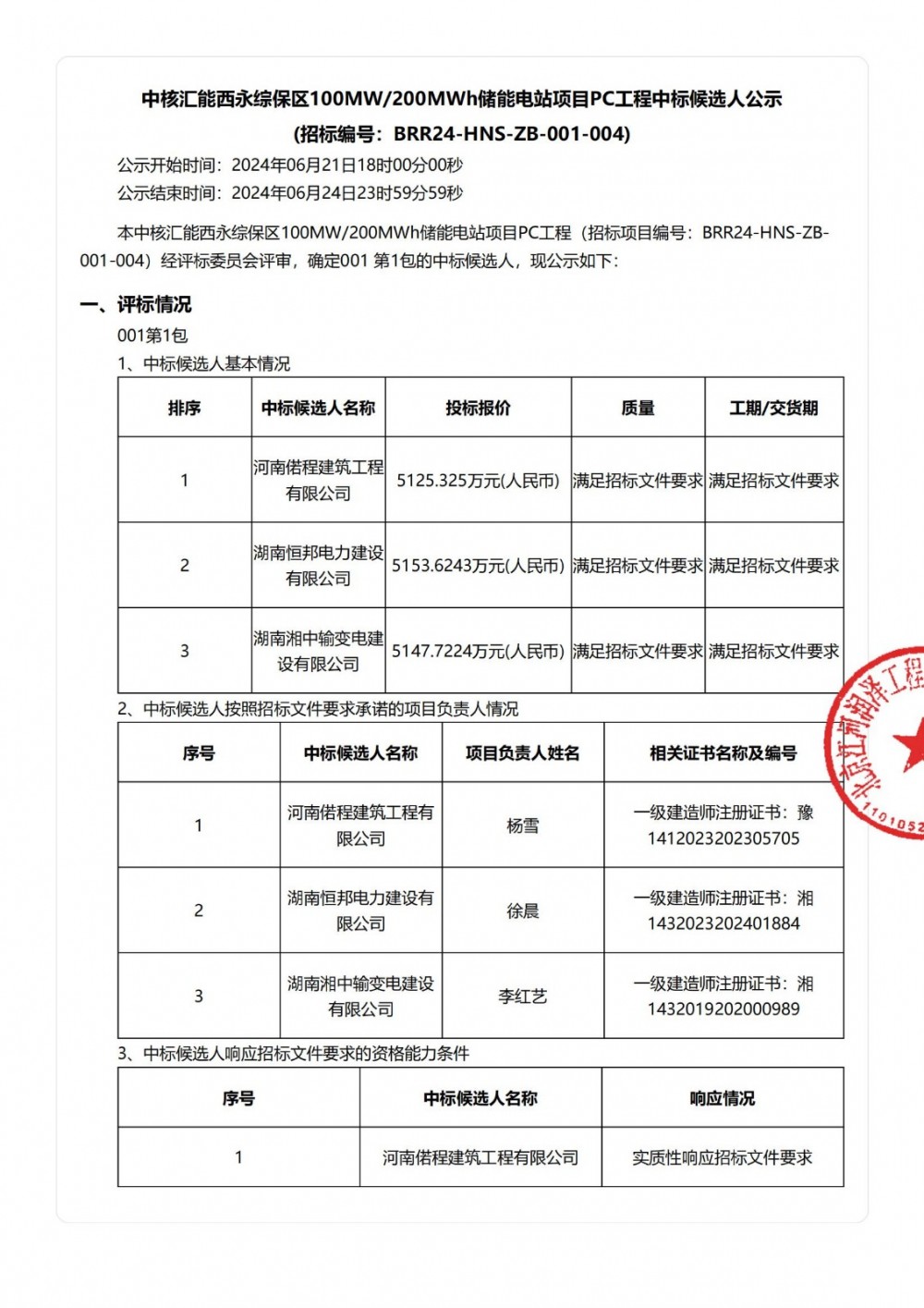 第一中标候选人为河南偌程建筑工程有限公司,投标报价5125.325万元;第二中标候选人为湖南恒邦电力建设有限公司,投标报价5153.6243万元;第三中标候选人为湖南湘中输变电建设有限公司,投标报价5147.7224万元。
