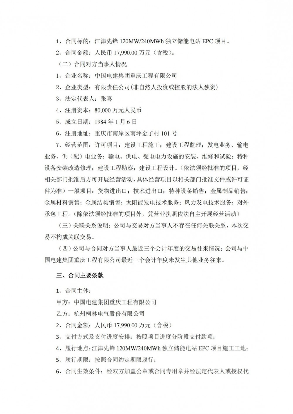 据电力家了解到,6月24日,杭州柯林发布公告称,公司于近日与中国电建集团重庆工程有限公司签订了江津先锋120MW/240MWh独立储能电站EPC项目储能设备及其附件采购合同,合同总金额为人民币17,990.00万元(含税)。