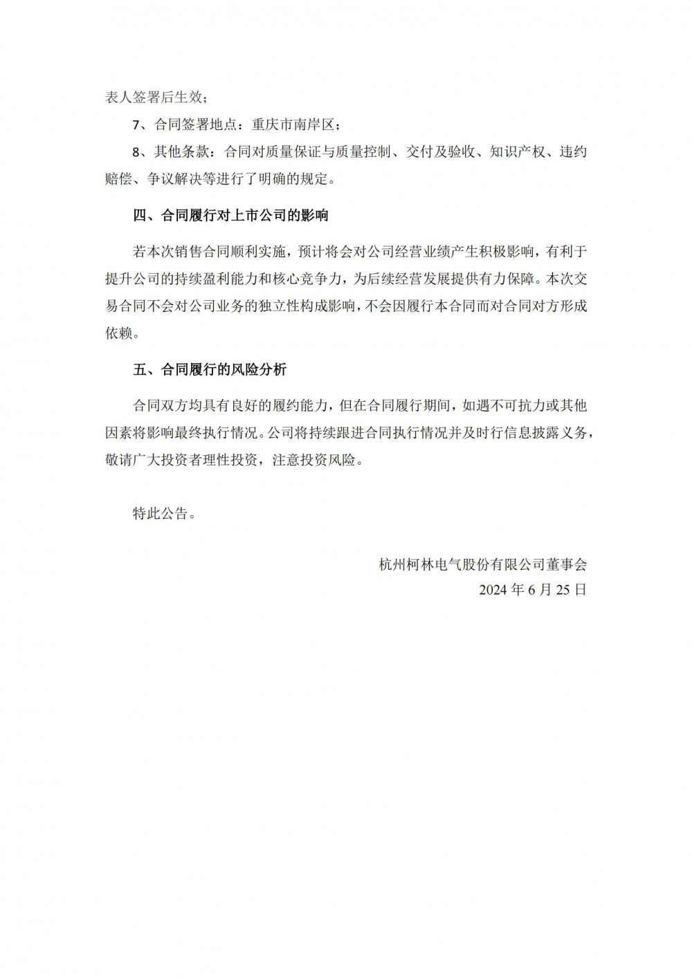 杭州柯林表示,若本次销售合同顺利实施,预计将会对公司经营业绩产生积极影响,有利于提升公司的持续盈利能力和核心竞争力,为后续经营发展提供有力保障。本次交易合同不会对公司业务的独立性构成影响,不会因履行本合同而对合同对方形成依赖。