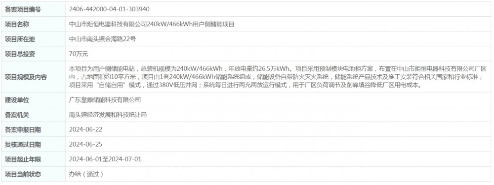 据电力家了解到,近日,中山市炬恒电器科技有限公司240kW/466kWh用户侧储能项目获得备案。项目位于中山市南头镇金海路22号,总投资70万元。