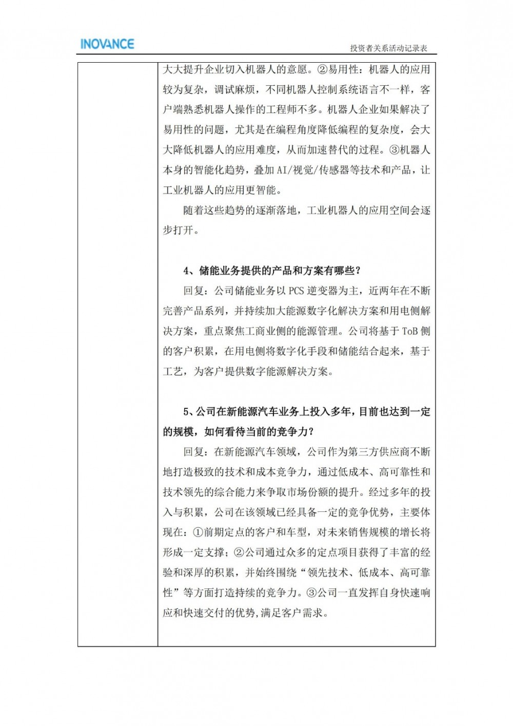 汇川技术表示,公司储能业务以PCS逆变器为主,近两年在不断完善产品系列,并持续加大能源数字化解决方案和用电侧解决方案,重点聚焦工商业侧的能源管理。公司将基ToB侧的客户积累,在用电侧将数字化手段和储能结合起来,基于工艺,为客户提供数字能源解决方案。
