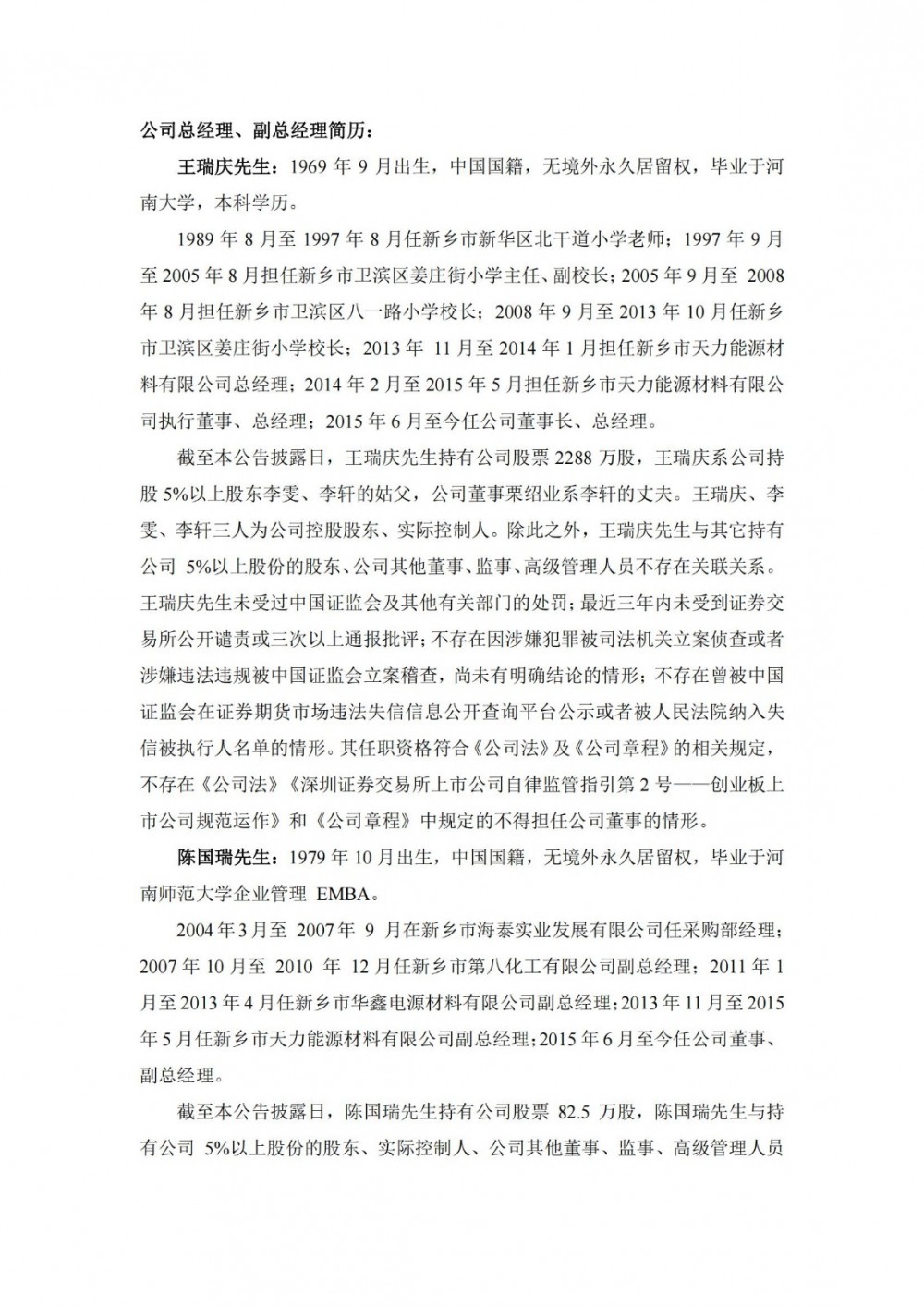 1989年8月至1997年8月任新乡市新华区北干道小学老师;1997年9月至2005年8月担任新乡市卫滨区姜庄街小学主任、副校长;2005年9月至2008年8月担任新乡市卫滨区八一路小学校长;2008年9月至2013年10月任新乡市卫滨区姜庄街小学校长;2013年11月至2014年1月担任新乡市天力能源材料有限公司总经理;2014年2月至2015年5月担任新乡市天力能源材料有限公司执行董事、总经理;2015年6月至今任公司董事长、总经理。
