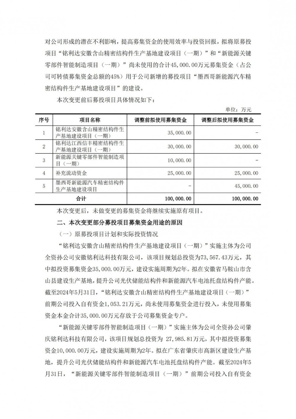 因此铭利达将两个募投项目调整为墨西哥新能源汽车精密结构件生产基地建设项目。