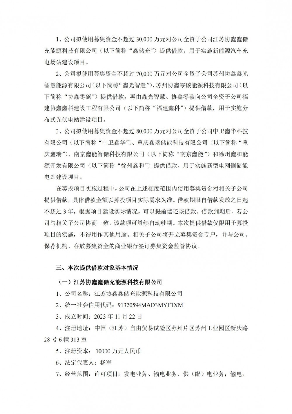 协鑫能科拟使用募集资金不超过30,000万元对公司全资子公司江苏协鑫鑫储充能源科技有限公司提供借款,用于实施新能源汽车充电场站建设项目。