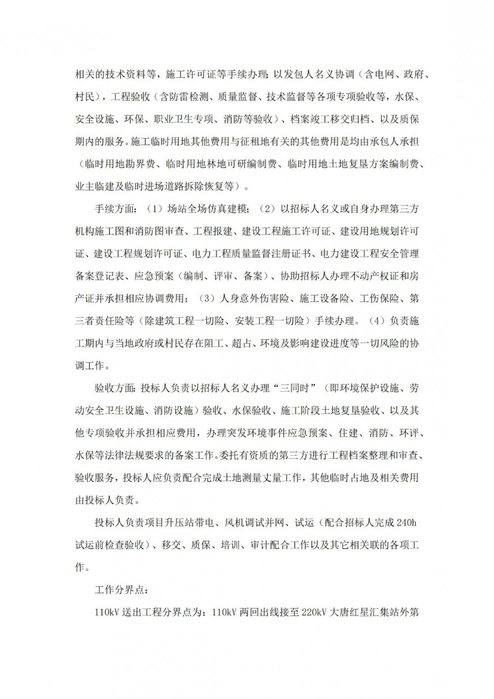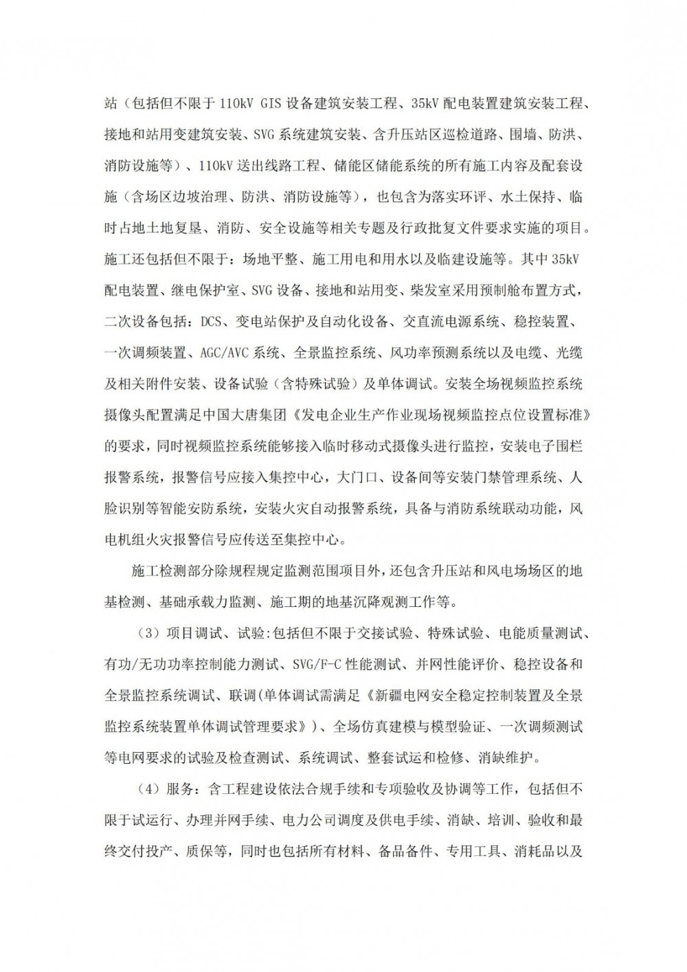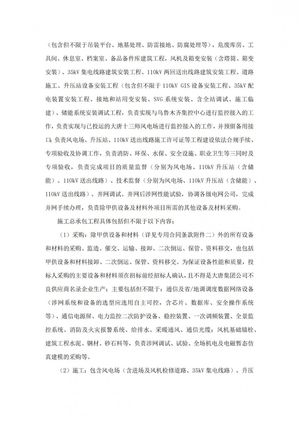 项目招标范围为大唐十三师红山农场20万千瓦风电配套储能项目风机及箱变、主变设备基础、110kVGIS设备基础、预制舱开关站基础、预制舱二次设备间基础、SVG设备基础、柴发室基础、储能电站基础、接地变和站用变基础工程(包含但不限于吊装平台、地基处理、防雷接地、防腐处理等),危废库房、工具间、休息室、档案室、备品备件库建筑工程,风机及箱变安装(含塔筒、箱变安装)、35kV集电线路建筑安装工程、110kV两回送出线路建筑安装工程、道路施工、升压站设备安装工程(包含但不限于110kVGIS设备安装工程、35kV配电装置安装工程、接地和站用变安装、SVG系统安装、含全站调试、施工临建)、储能系统安装调试工程,负责实现与乌鲁木齐集控中心进行监控接入的工作,负责实现与已投运的大唐十三师风电场进行监控接入的工作,并预留备用接口;负责风电场、升压站、110kV送出线路施工许可证等工程建设依法合规手续、专项验收及协调工作,负责消防、环保、水保、安全设施、职业卫生等三同时及专项验收,负责完成项目的质量监督(分别为风电场、110kV升压站(含储能)、110kV送出线路)、技术监督(分别为风电场、110kV升压站(含储能)、110kV送出线路)、并网调试、并网后涉网性能试验,协调各级电网公司,完成并网手续办理,负责除甲供设备及材料外项目所需的其他设备及材料采购。