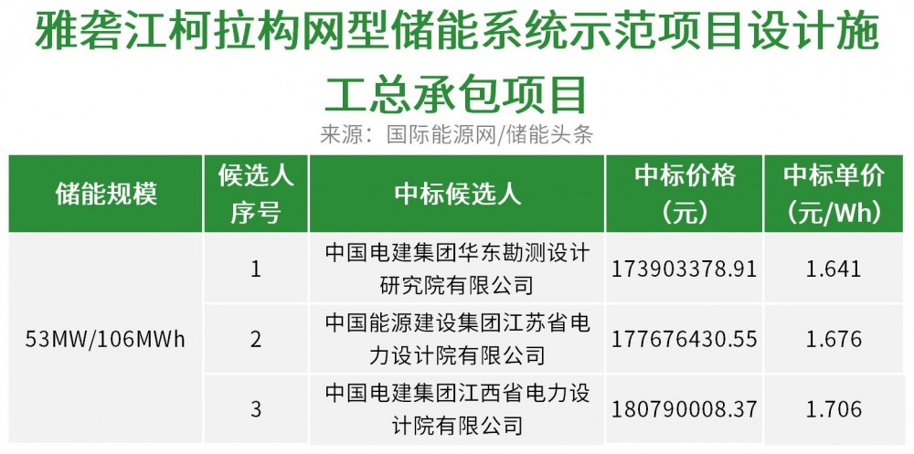 中标候选人第1名为中国电建集团华东勘测设计研究院有限公司,投标报价173903378.91元,折合单价1.641元/Wh;中标候选人第2名为中国能源建设集团江苏省电力设计院有限公司,投标报价177676430.55元,折合单价1.676元/Wh;中标候选人第3名为中国电建集团江西省电力设计院有限公司,投标报价180790008.37元,折合单价1.706元/Wh。