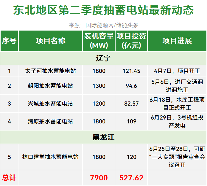 东北地区有5个抽水蓄能电站更新了动态,装机总规模为7.9GW,项目总投资527.62亿元