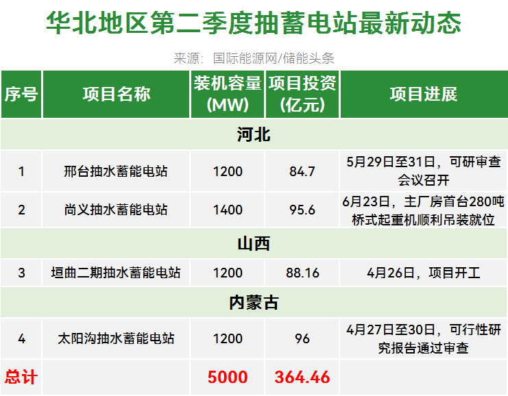 华北地区有4个抽水蓄能电站更新了动态,装机总规模为5GW,项目总投资364.46亿元