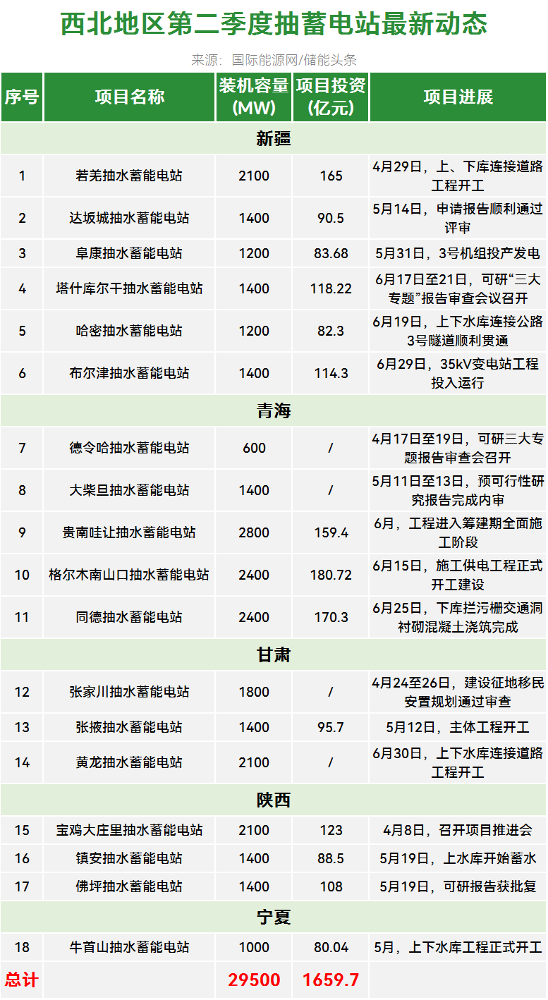 西北地区有18个抽水蓄能电站更新了动态,装机总规模为29.5GW,项目总投资1659.66亿元