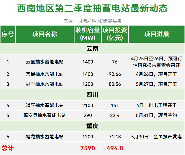 西南地区有6个抽水蓄能电站更新了动态,装机总规模为7.59GW,项目总投资494.8亿元