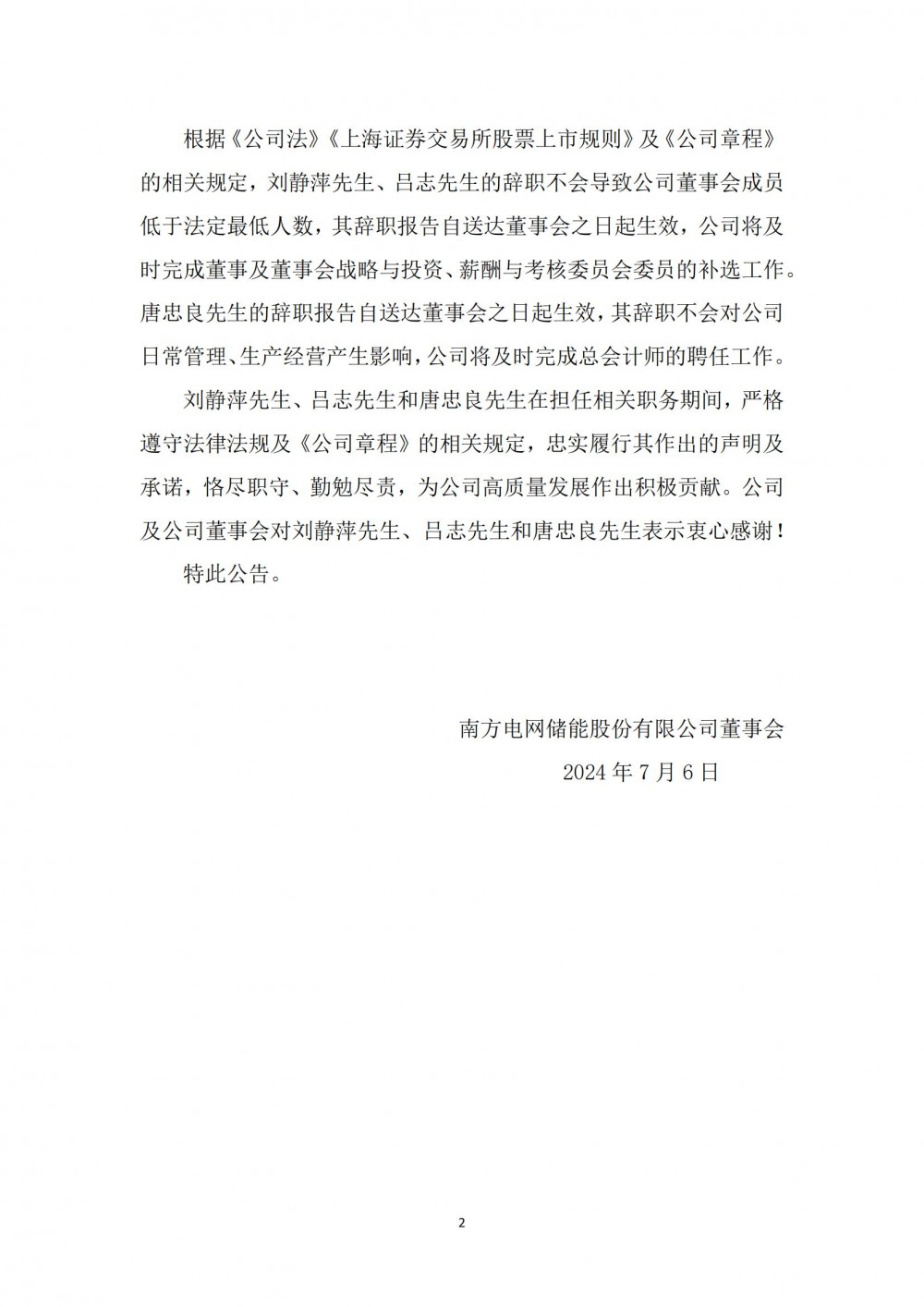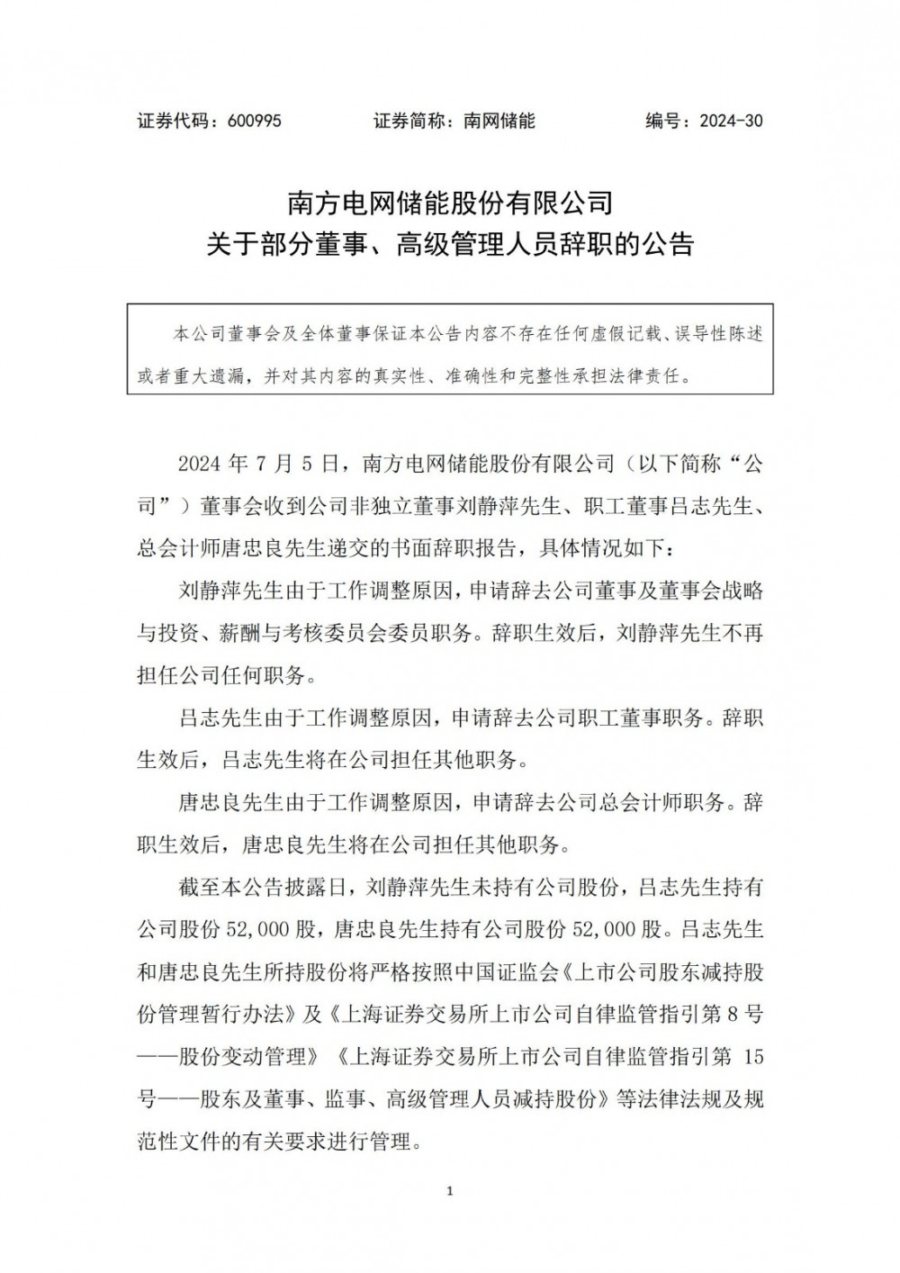 据电力家了解到,7月5日,南网储能发布公告称,公司董事会收到公司非独立董事刘静萍先生、职工董事吕志先生、总会计师唐忠良先生递交的书面辞职报告,具体情况如下: