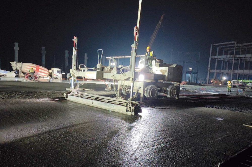 厂房单体结构建设需要大跨度的平整地面,为避免轻微震动影响产品的良率,智能化设备对地坪平整度要求达到毫米级。项目团队在混凝土浇筑过程中,在常规施工流程基础上增加平板振动器,有效解决混凝土振捣不密实难题,并引入大型红外线激光找平机,利用激光精准控制表面平整度,确保每个监测点间误差不超过3毫米,实现厂房地面平整度高于国家标准2毫米。同时,项目在地坪施工增设铠装缝,通过其自身的抗收缩膨胀能力吸收混凝土收缩应力,最大程度减少混凝土裂缝的产生,有效确保地面平整度。