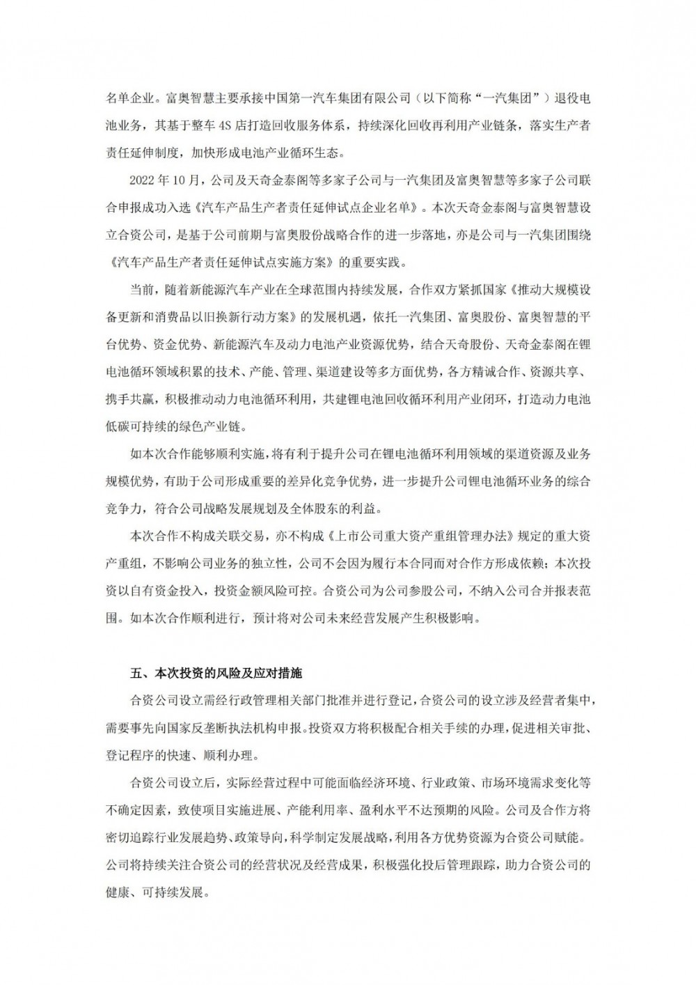7月10日,天奇股份发布公告称,公司全资子公司江西天奇金泰阁钴业有限公司拟与富奥汽车零部件股份有限公司(以下简称“富奥股份”)下属全资子公司富奥智慧能源科技有限公司共同出资设立合资公司,并以合资公司为主体合作开展电池材料再生利用业务。