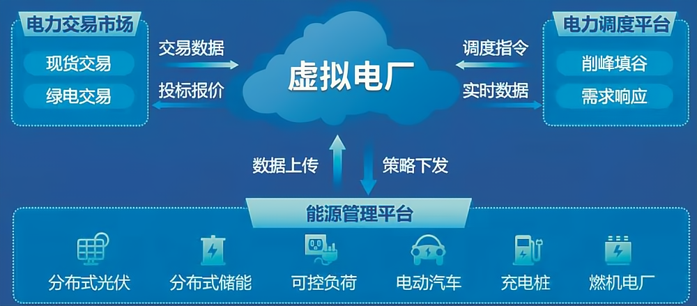 虚拟电厂的本质,是一种能源协调管理系统,应用数字化技术、控制技术、物联网技术与通信技术,将分布式电源、储能、可调负荷等分布式资源进行聚合管理与优化,通过需求侧响应、电力辅助服务、电力现货等市场交易,为电力系统提供调节支撑能力。
