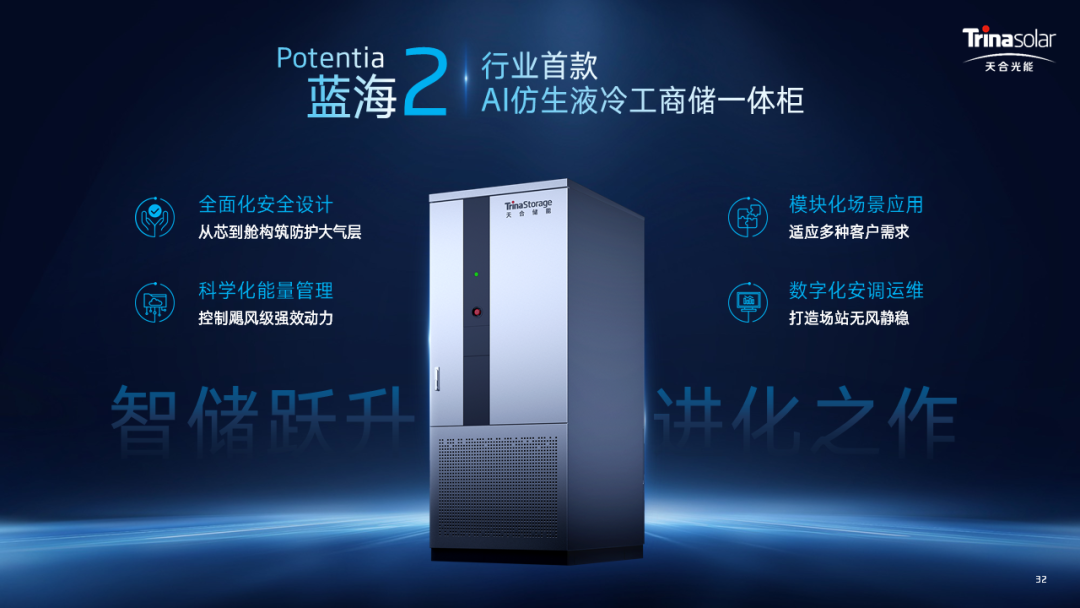 天合储能坚持创新引导、品质为本、服务至上的布局理念,精准捕捉市场革新趋势和潜在需求,以成熟可靠的产品在高速迭代的储能赛道上持续推进全球光储垂直一体化发展。6月12日,天合光能发布了行业首款AI仿生液冷工商业储能系统Potentia蓝海2。秉持产品优化、技术创新、服务精进、场景拓展的四维升级理念,天合储能Potentia蓝海系列工商业储能产品及解决方案将持续助力开拓工商储多元盈利渠道。
