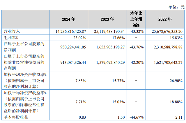 4月15日,贝特瑞发布2024年年度报告,报告期内,公司实现营业收入142.37亿元,同比下降43.32%,实现归属于上市公司股东的净利润9.30亿元,同比下降43.76%;公司负极材料销量同比增长,突破43万吨,正极材料销量同比下滑至约2万吨。业绩变动主要是因公司负极材料受到价格下降影响,正极材料受到终端客户价量齐跌的