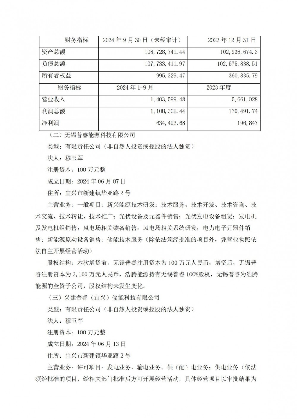 2、浩腾能源完成增资后,拟向其全资子公司无锡普睿能源科技有限公司增资人民币3,000万元;