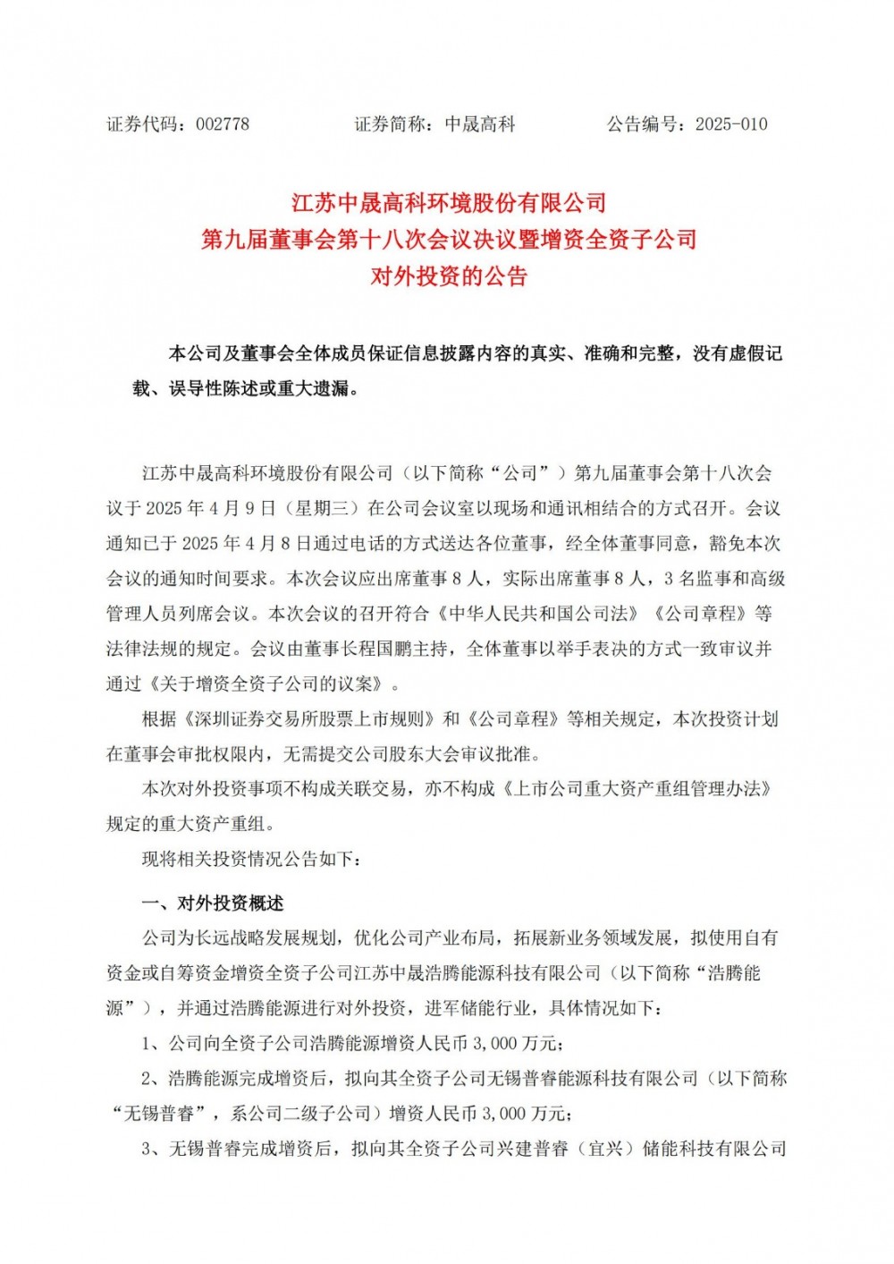 近日,中晟高科发布公告称,公司为长远战略发展规划,优化公司产业布局,拓展新业务领域发展,拟使用自有资金或自筹资金增资全资子公司江苏中晟浩腾能源科技有限公司,并通过浩腾能源进行对外投资,进军储能行业,具体情况如下: