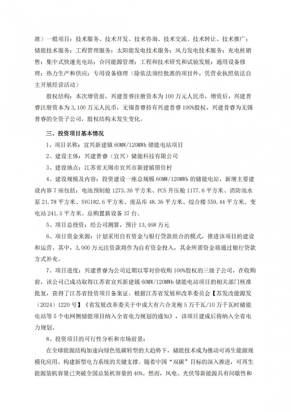 3、无锡普睿完成增资后,拟向其全资子公司兴建普睿(宜兴)储能科技有限公司增资3000万元,兴建普睿将作为新型储能项目的运营主体建设“宜兴新建镇60MW/120MWh储能电站项目”,项目总投资预计13,468万元,3,000万元注资款将作为自有资金投入,其余所需资金将通过银行贷款方式补充。