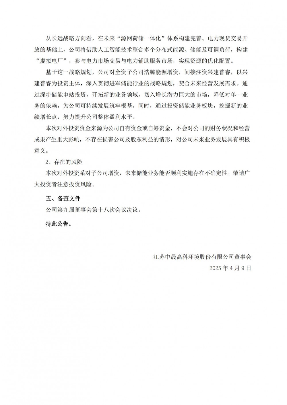 中晟高科表示,公司对全资子公司浩腾能源增资,间接注资兴建普睿,以兴建普睿为投资主体,深入贯彻进军储能行业的战略规划,契合未来经营发展需求。通过深耕储能电站投资,开拓新的业务领域,切入增长潜力巨大的市场,降低对单一业务的依赖,为公司可持续发展筑牢根基。同时,通过投资储能业务板块,挖掘新的业绩增长点,努力提升公司整体盈利水平。