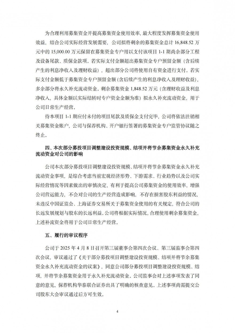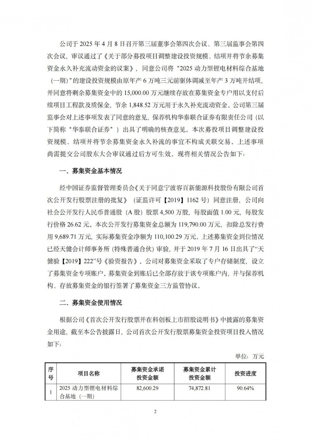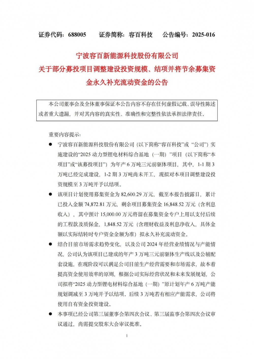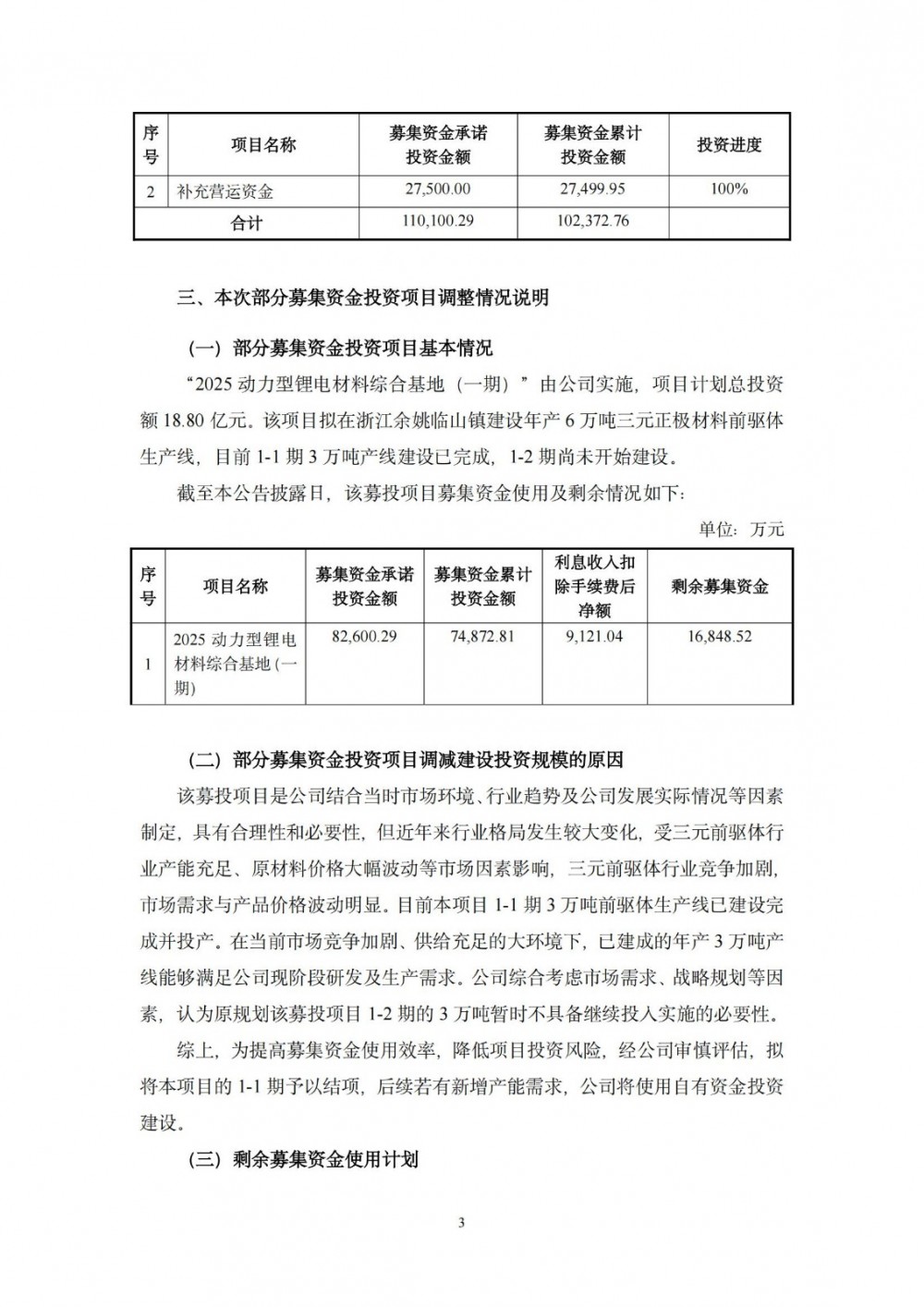 结合目前市场需求趋势变化,以及公司2024年经营业绩情况与产能情况,容百科技认为该项目已建成的年产3万吨三元前驱体生产线以及公辅配套设施,在现阶段可以满足公司目前生产经营需要和市场需求,故本着提高资金使用效率的原则,根据公司实际经营状况和未来发展规划,公司拟将“2025动力型锂电材料综合基地(一期)”原计划年产6万吨产能规划调减至3万吨并予以结项。后续3万吨若有相应产能需求,公司将使用自有资金投资建设。