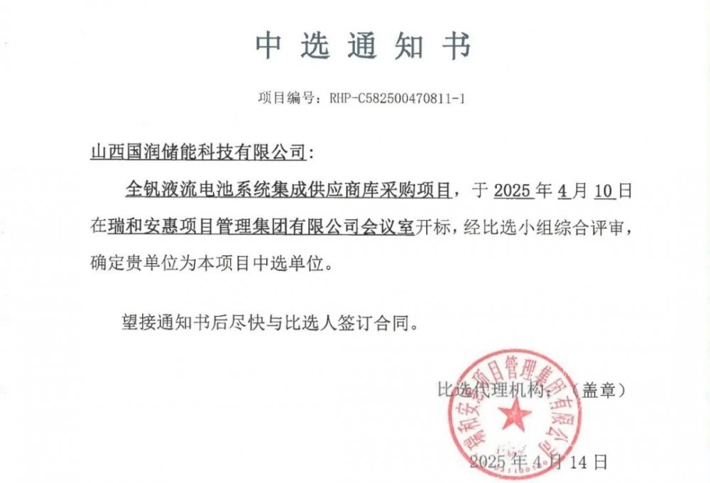 4月14日,河北建投中航塞罕绿能科技开发有限公司发布全钒液流电池系统集成供应商库采购项目中选公告,山西国润储能科技有限公司成功中选。