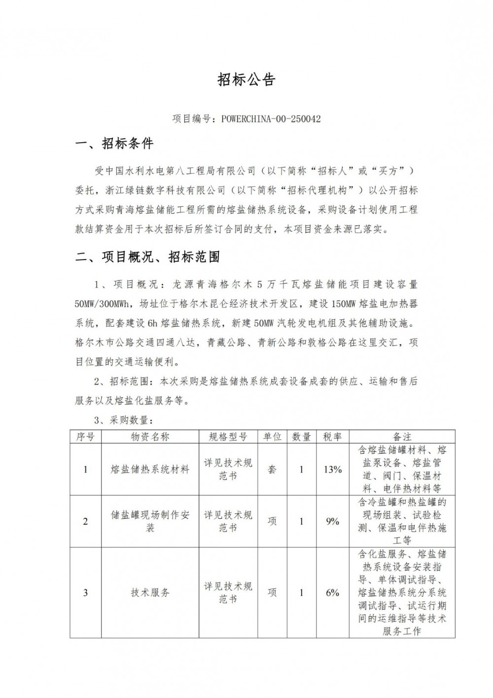 近日,中国电建青海熔盐储能工程熔盐储热系统采购项目招标公告发布。
