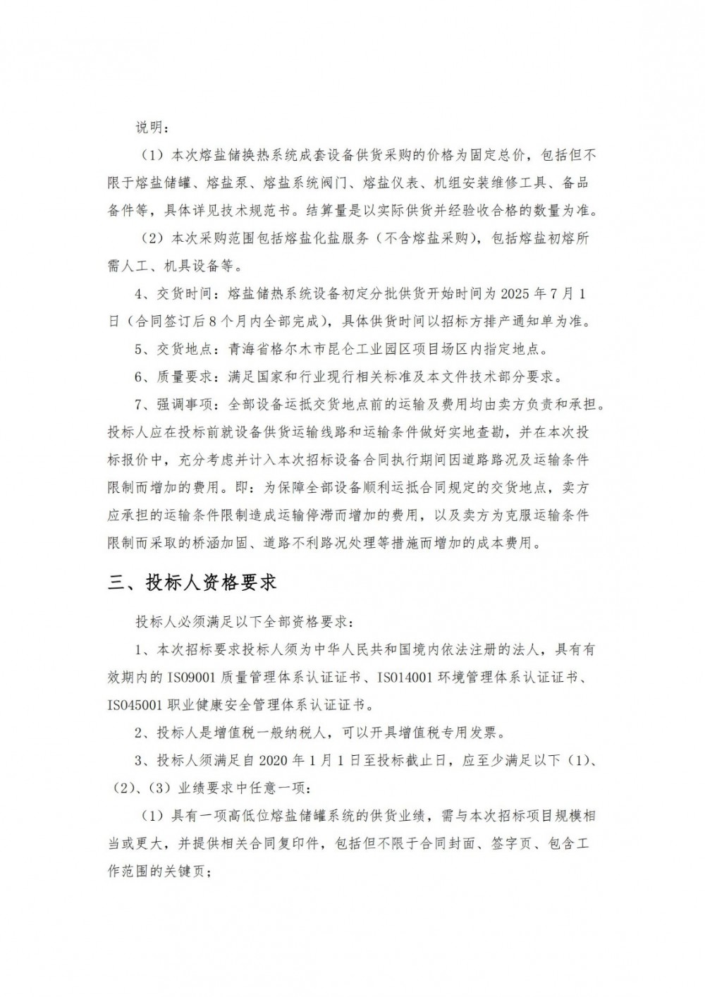 (1)具有一项高低位熔盐储罐系统的供货业绩,需与本次招标项目规模相当或更大,并提供相关合同复印件,包括但不限于合同封面、签字页、包含工作范围的关键页;