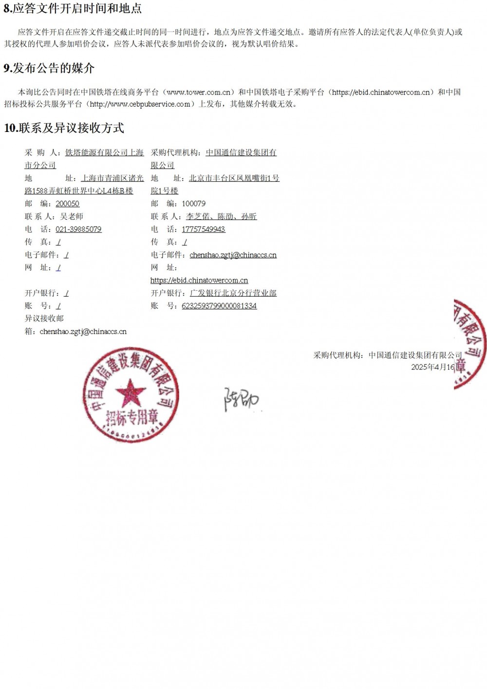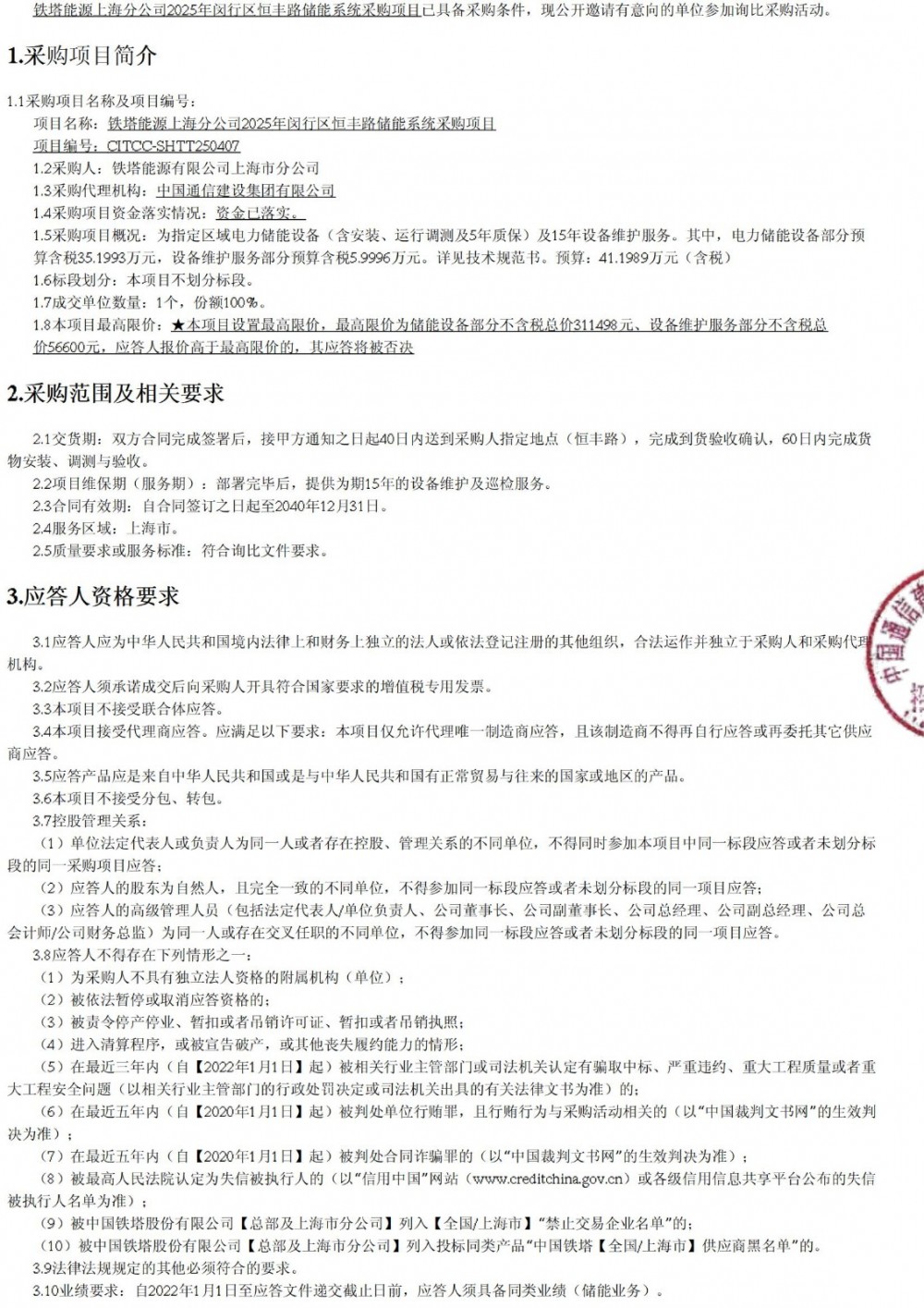 4月16日,铁塔能源上海分公司2025年闵行区恒丰路储能系统采购项目询比公告发布。