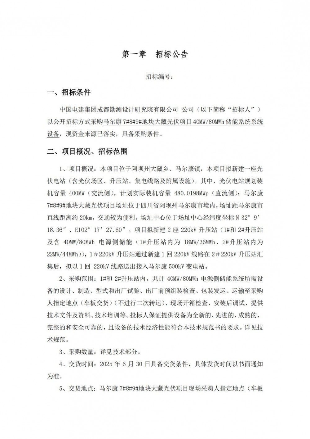 近日,中国电建成都院马尔康7号8号9号地块大藏光伏项目40MW/80MWh储能系统设备采购项目招标公告发布。