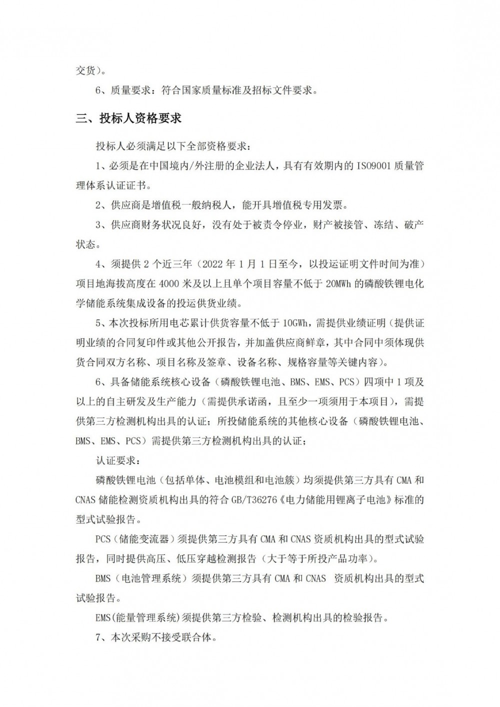 投标人须提供2个近三年(2022年1月1日至今,以投运证明文件时间为准)项目地海拔高度在4000米及以上且单个项目容量不低于20MWh的磷酸铁锂电化学储能系统集成设备的投运供货业绩。