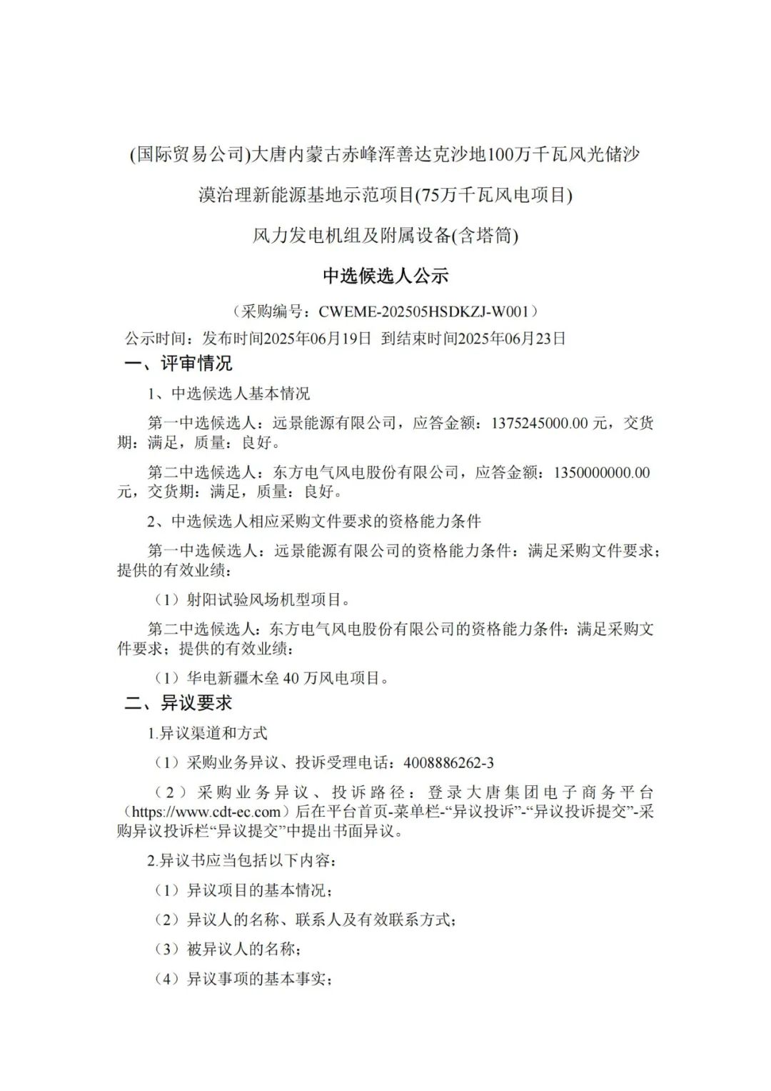 根据公示,远景能源、金风科技作为第一中标候选人预中标。
