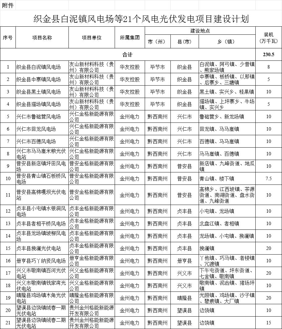 通知指出,按照省政府工作部署,贵州省能源局结合实际研究制定了织金县白泥镇风电场等21个风电光伏发电项目建设计划,总装机230.5万千瓦,现予以下达。