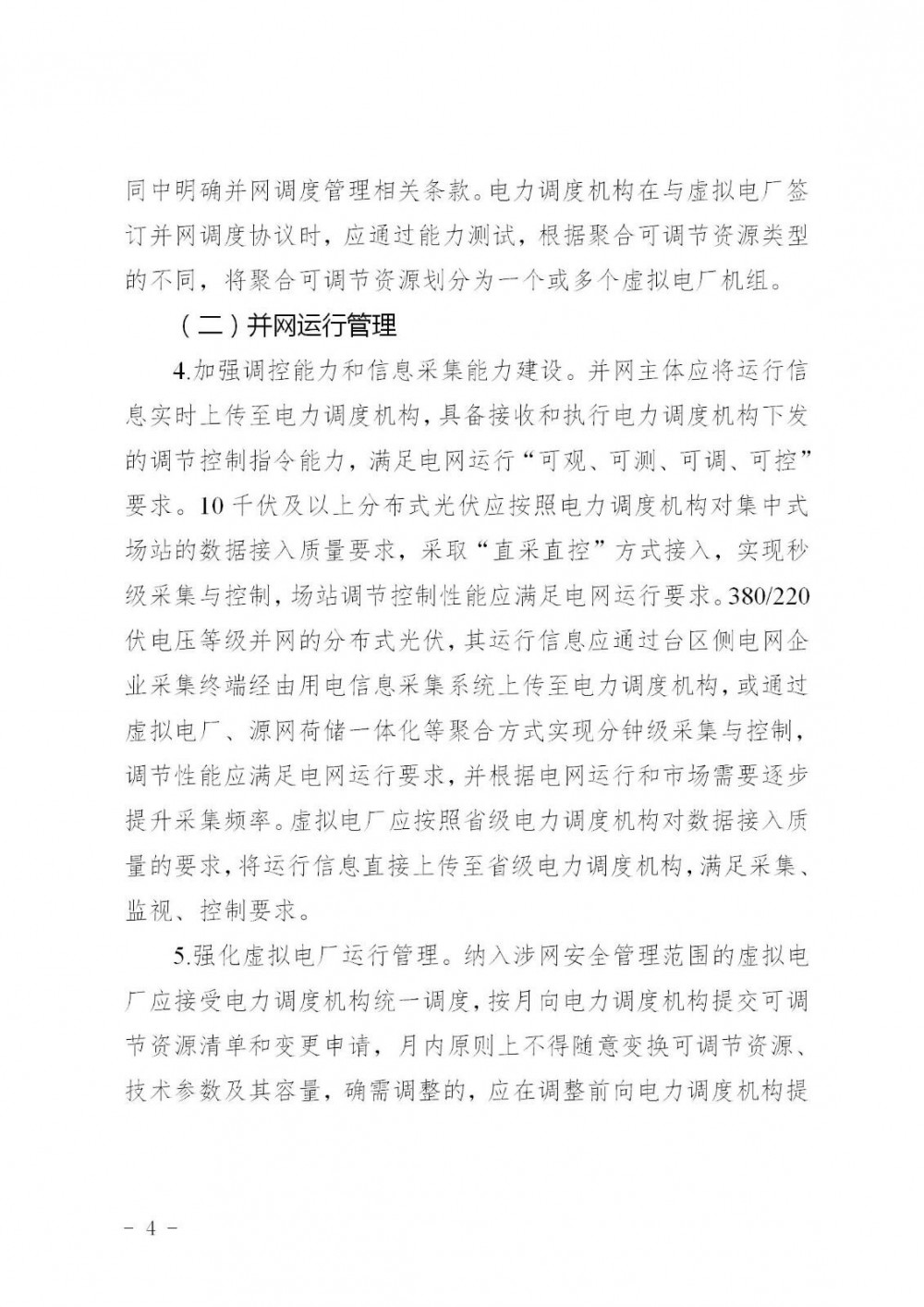 电网企业要坚持统一调度、分级管理,组织纳入涉网安全管理范围的并网主体签订并网调度协议,其中10千伏及以上并网主体由相应电力调度机构组织签订并网调度协议,380/220伏电压等级并网的分布式光伏应在购售电合同中明确并网调度管理相关条款。电力调度机构在与虚拟电厂签订并网调度协议时,应通过能力测试,根据聚合可调节资源类型的不同,将聚合可调节资源划分为一个或多个虚拟电厂机组。