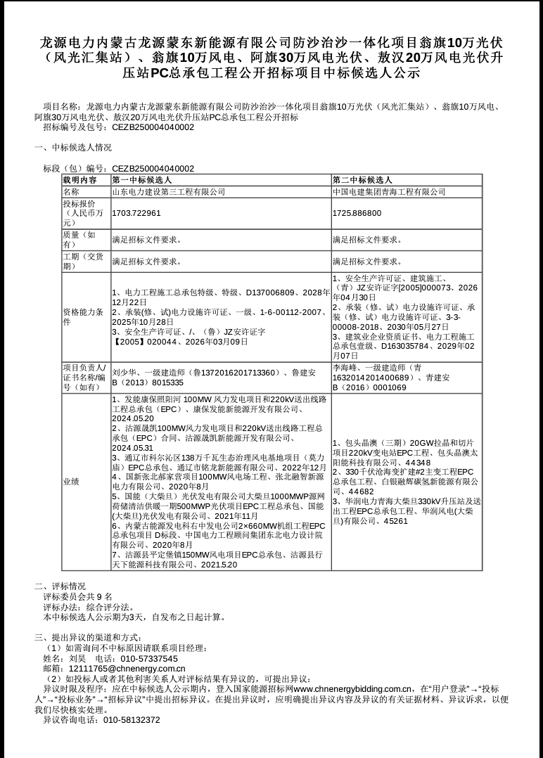 山东电力建设第三工程有限公司成为标包二的第一候选人;