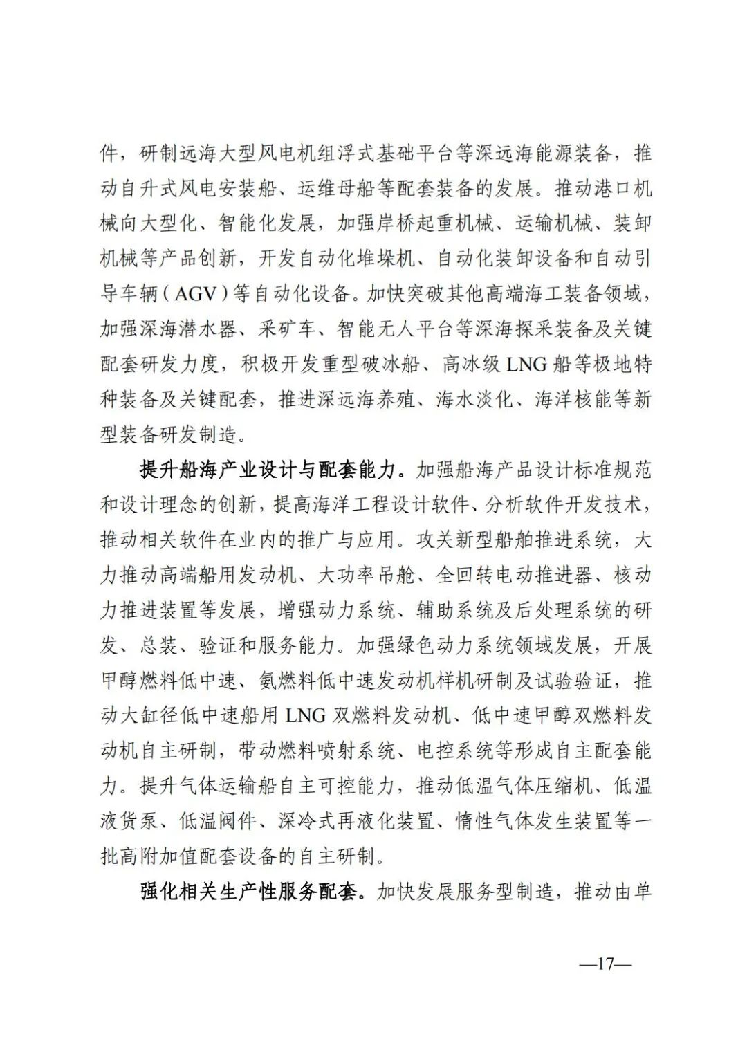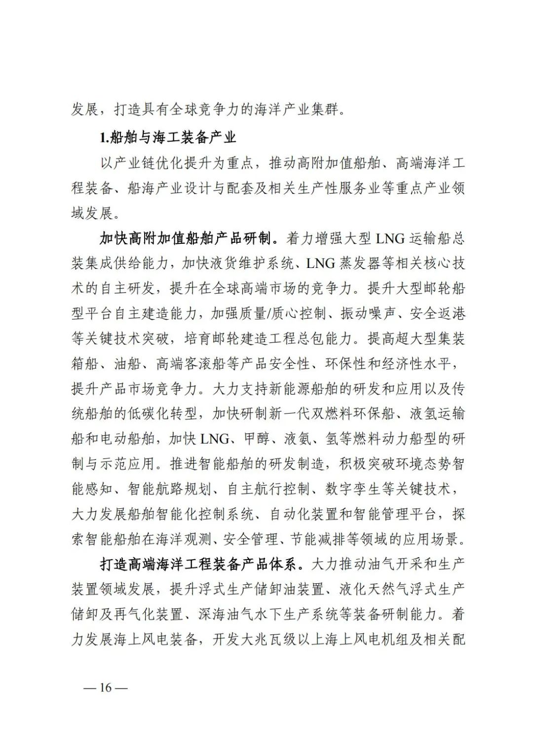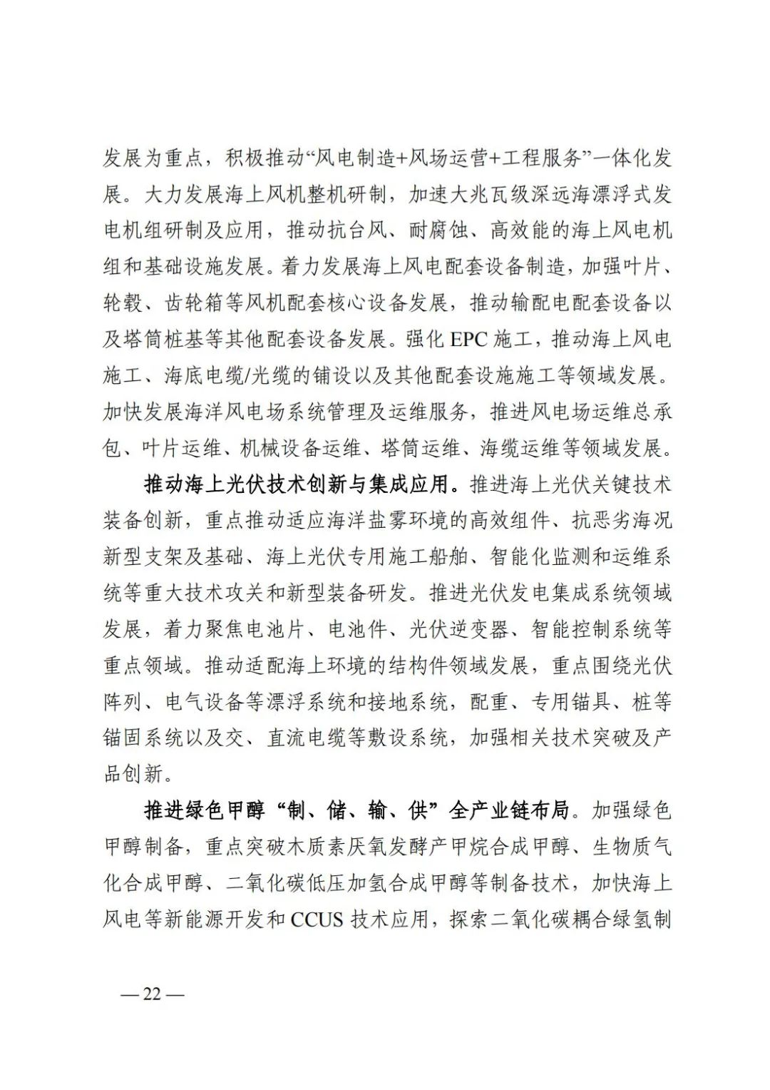 文件指出,打造高端海洋工程装备产品体系。着力发展海上风电装备,开发大兆瓦级以上海上风电机组及相关配件,研制远海大型风电机组浮式基础平台等深远海能源装备,推动自升式风电安装船、运维母船等配套装备的发展。